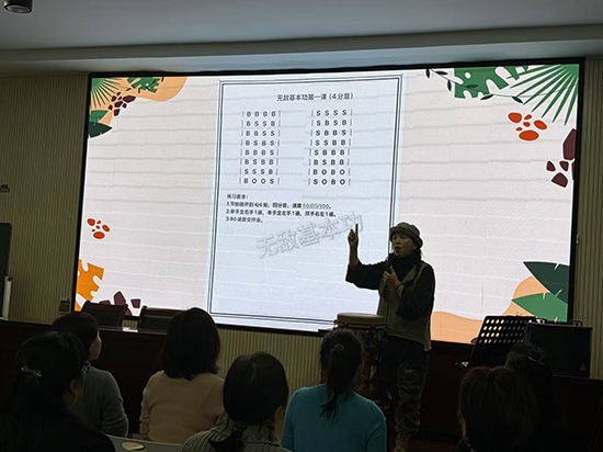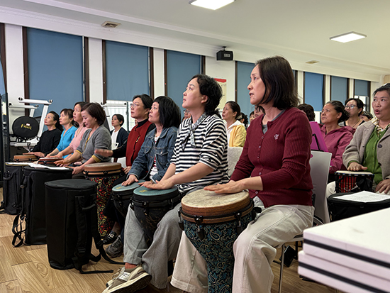 課堂上,近50名學(xué)員興致高漲,跟著老師的節(jié)奏認真練習、反復(fù)磨合,手掌敲擊鼓面的清脆聲響此起彼伏,從零散生疏到整齊合拍,歡快的鼓點回蕩在課堂內(nèi)外。老師耐心糾錯、悉心指導(dǎo),學(xué)員們相互交流、共同進步,現(xiàn)場氣氛輕松熱烈、其樂融融。