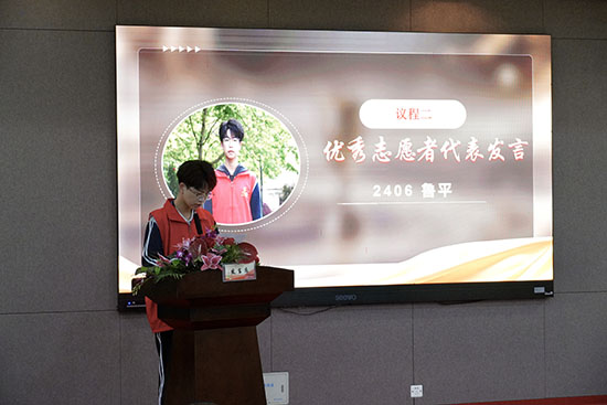 大會在熱烈的掌聲中拉開帷幕。現場循環播放的學院志愿服務紀實視頻《青荷凝微光,志愿匯暖陽》,將觀眾帶入溫暖的志愿服務回憶中。志愿者代表2406魯平作為優秀志愿者代表登臺發言,結合自身志愿服務經歷,分享了在實踐中的成長與感悟。他動情地講述著服務過程中的點滴收獲,言語間滿是對志愿事業的熱愛與堅守,將“奉獻、友愛、互助、進步”的志愿精神傳遞給現場每一位師生,引發了深深共鳴。