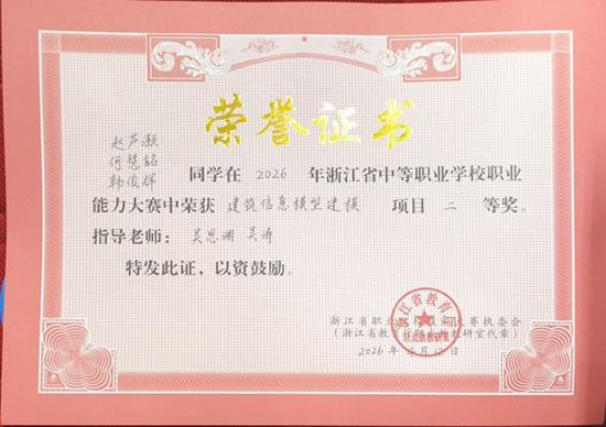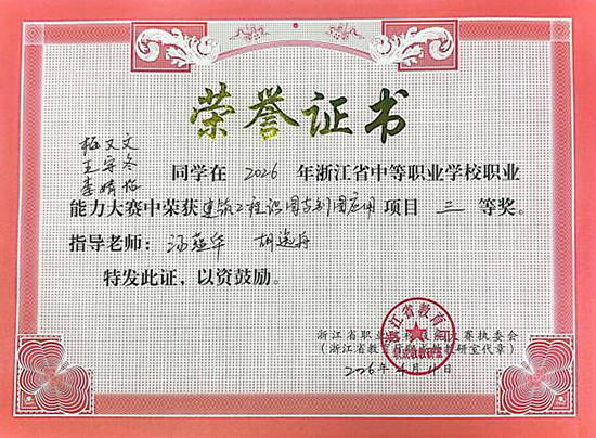 4月11日至12日,2026年浙江省中等職業(yè)學(xué)校職業(yè)能力大賽(學(xué)生技術(shù)技能類)建筑工程識圖與制圖應(yīng)用、建筑信息模型建模兩大賽項分別在杭州落幕。嘉興市建筑工業(yè)學(xué)校兩支代表隊?wèi){借扎實功底、默契協(xié)作與穩(wěn)定發(fā)揮,在全省強(qiáng)隊中奮勇拼搏,雙雙斬獲團(tuán)體獎項,充分彰顯學(xué)校土木建筑大類專業(yè)育人成效。