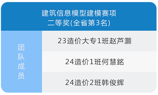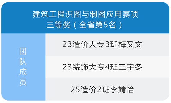 其中,23造價大專1班趙蘆灝、24造價1班何慧銘、24造價2班韓俊輝組成的團(tuán)隊,榮獲建筑信息模型建模賽項全省二等獎(第3名);23造價大專3班梅又文、23裝飾大專4班王宇冬、25造價2班李婧怡組成的團(tuán)隊,斬獲建筑工程識圖與制圖應(yīng)用賽項全省三等獎(第5名)。