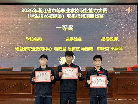 在2026年浙江省中等職業學校職業能力大賽(學生技術技能類)中,諸暨市職業教育中心積極組織參賽,所參加的五項賽事全部獲獎,其中農機檢修、園林微景觀設計與制作兩個項目榮獲省一等獎并成功晉級全國大賽,新能源汽車維修、種養技術、嬰幼兒保育三個項目榮獲省三等獎。本次大賽是浙江省職業教育技能比賽中較最權威賽事,能從全面檢驗中職學校技術技能人才培養的水平。學校參賽師生面對強手如林的競爭環境,沉著應戰、穩定發揮,在多個賽項中脫穎而出,充分展現了學校扎實的技能教學成果和學子精湛的專業素養。