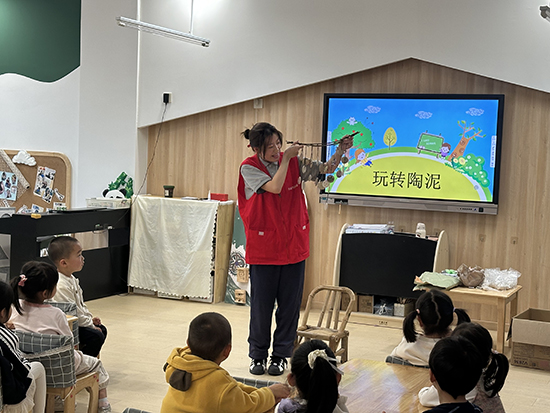 志愿者們充分發(fā)揮專(zhuān)業(yè)所長(zhǎng),貼合幼兒認(rèn)知特點(diǎn),以生動(dòng)有趣、淺顯易懂的語(yǔ)言,向小朋友們講解自然物壓印泥塑的制作方法。她們俯下身來(lái),與孩子們目光平視,耐心示范:如何將一片樹(shù)葉輕輕按在泥面上,如何用花瓣勾勒出春天的輪廓,如何讓自然印記化作風(fēng)鈴上獨(dú)特的紋理。她們的每一次微笑,每一次蹲下,都是專(zhuān)業(yè)課堂向生動(dòng)實(shí)踐的無(wú)聲延伸。